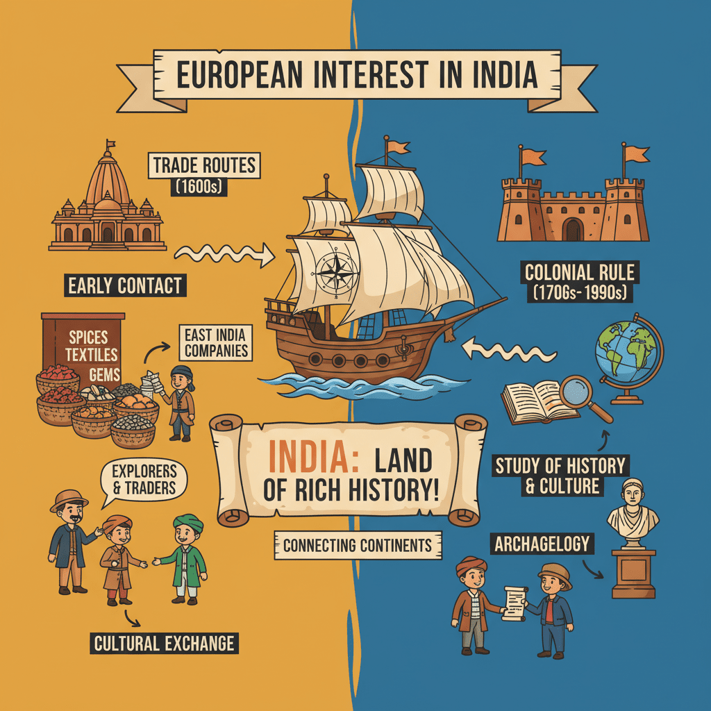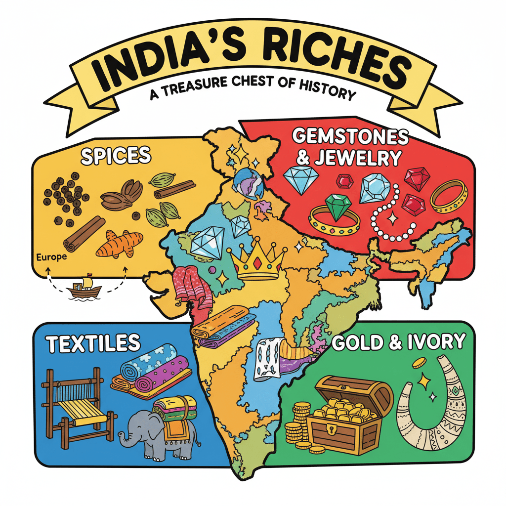 Did you figure out the answer? That's right, the answer is 'British'! These are the people who came to India centuries ago. Now, we're going to explore why they came and how everything unfolded. For centuries, India was known for its incredible wealth and natural resources. Indian merchants traded valuable goods like cotton, silk, spices, and precious metals far and wide, becoming rich and famous. This attracted foreign merchants, especially Europeans, who wanted to profit from trading with India. Spices were a particularly hot commodity!