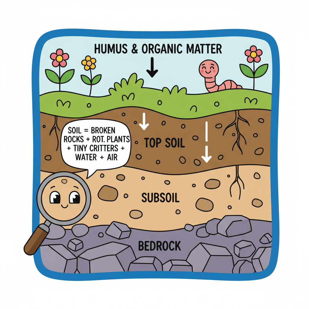 Alright class, today we're diving into the wonderful world of soil! Many of you probably already know that soil comes from rocks breaking down over time. You might also know about the different layers of soil, like topsoil, subsoil, and bedrock. And who remembers what makes the topsoil so good for plants? That's right, humus! Plus, soil is full of important minerals.