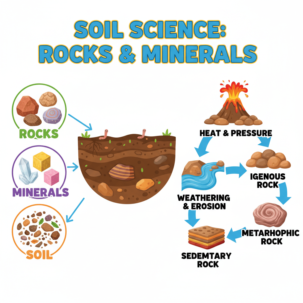 As we learn, I want you to think about the main things that make up soil. Remember that even deep below the Earth’s surface, we find rocks, sometimes in a molten form! We'll learn how these rocks, along with minerals, play a vital role in forming the soil we depend on.