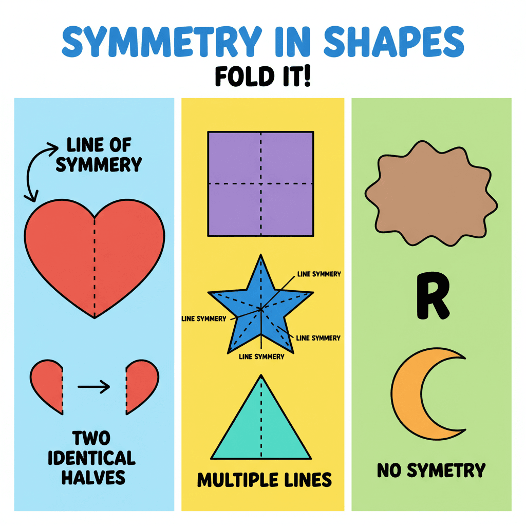 Think about letters for a second, like J, L, or Q. If you try to draw a line through them, can you find a way to divide them into two identical halves? Probably not! But something like a star or a square? You can fold those in several ways and the sides will still match up! Keep exploring and see what other symmetrical shapes you can find around you.
