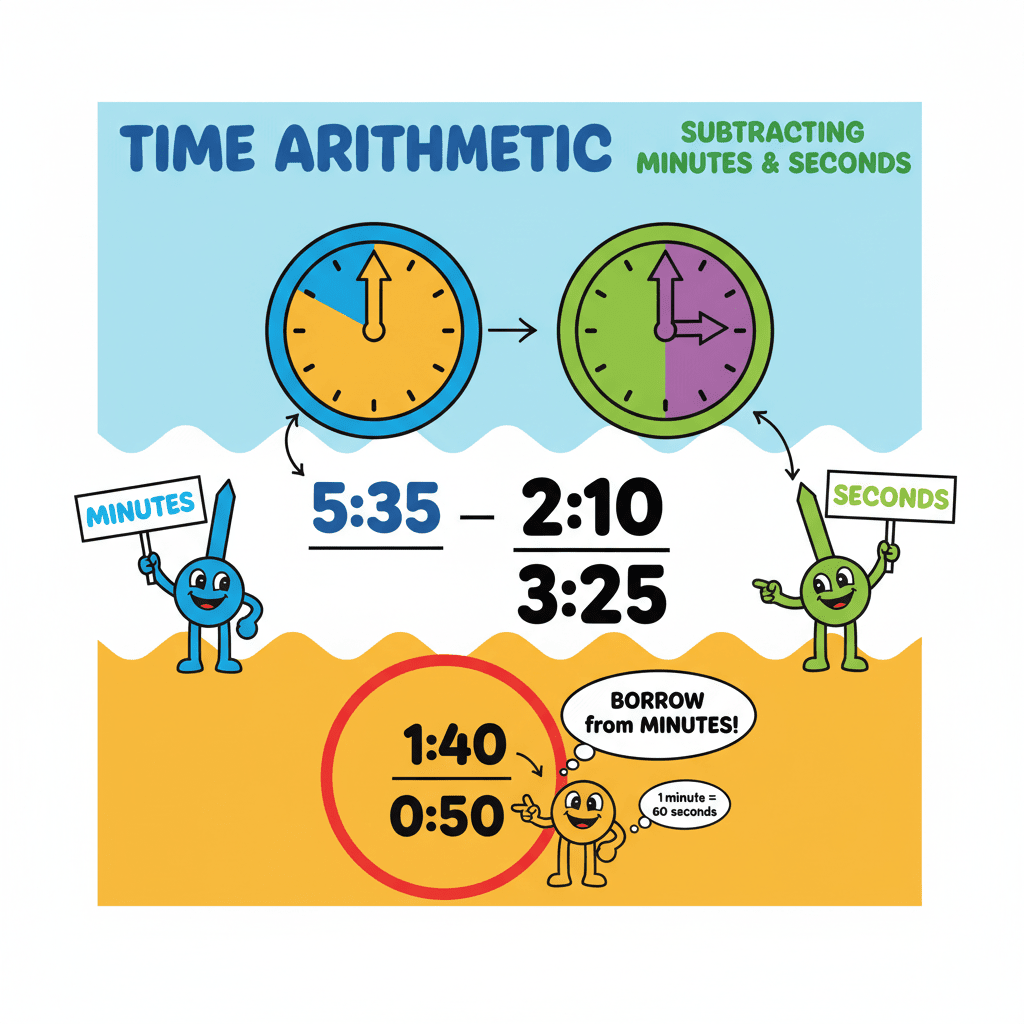 First, we'll practice adding different durations. We'll go step by step, making sure to carry over when we reach 60 seconds or 60 minutes. Then, we will subtract time, in a very similar way to addition, but here we will "borrow" when the number we are subtracting is larger than the number we are subtracting from.
